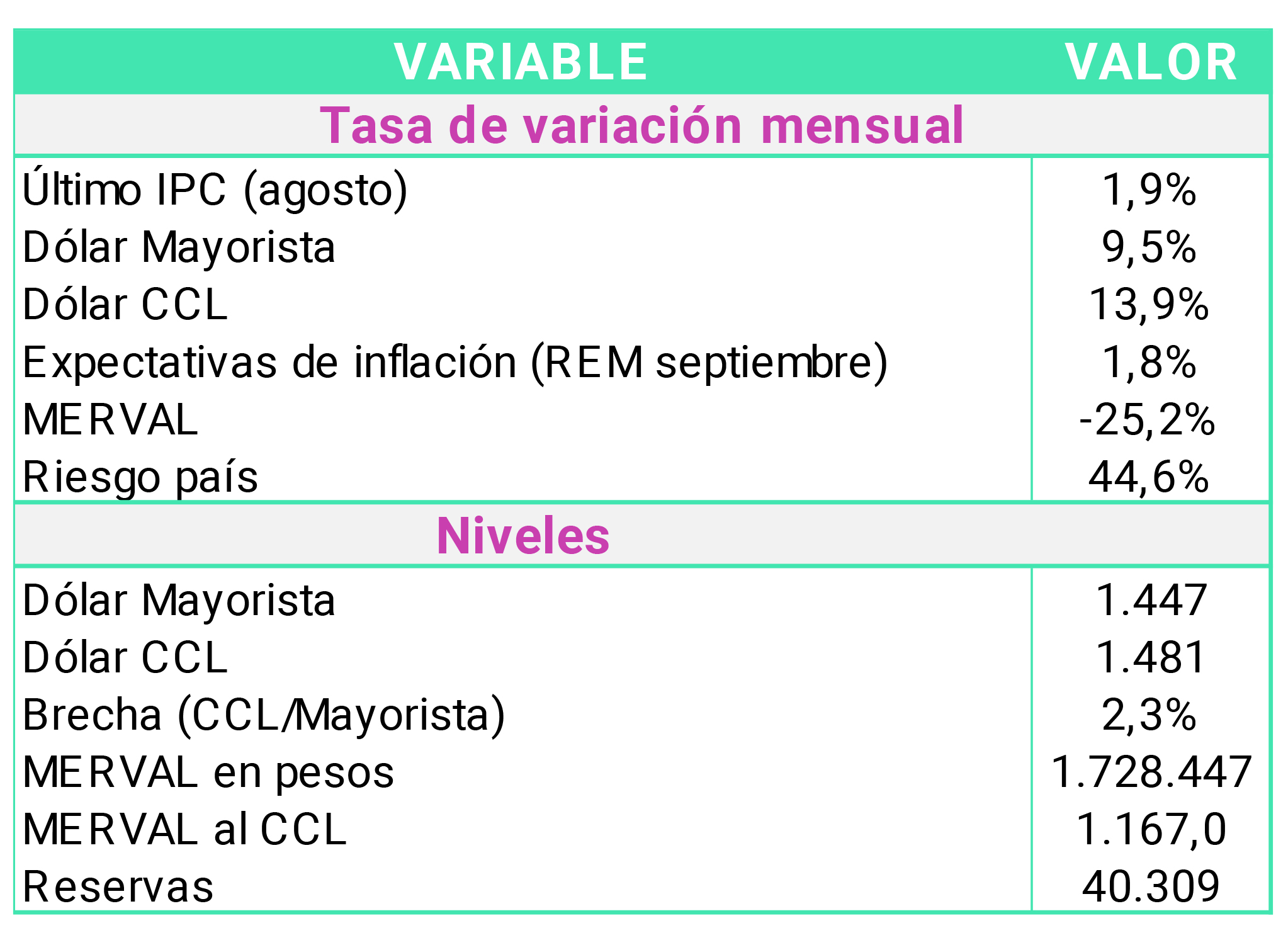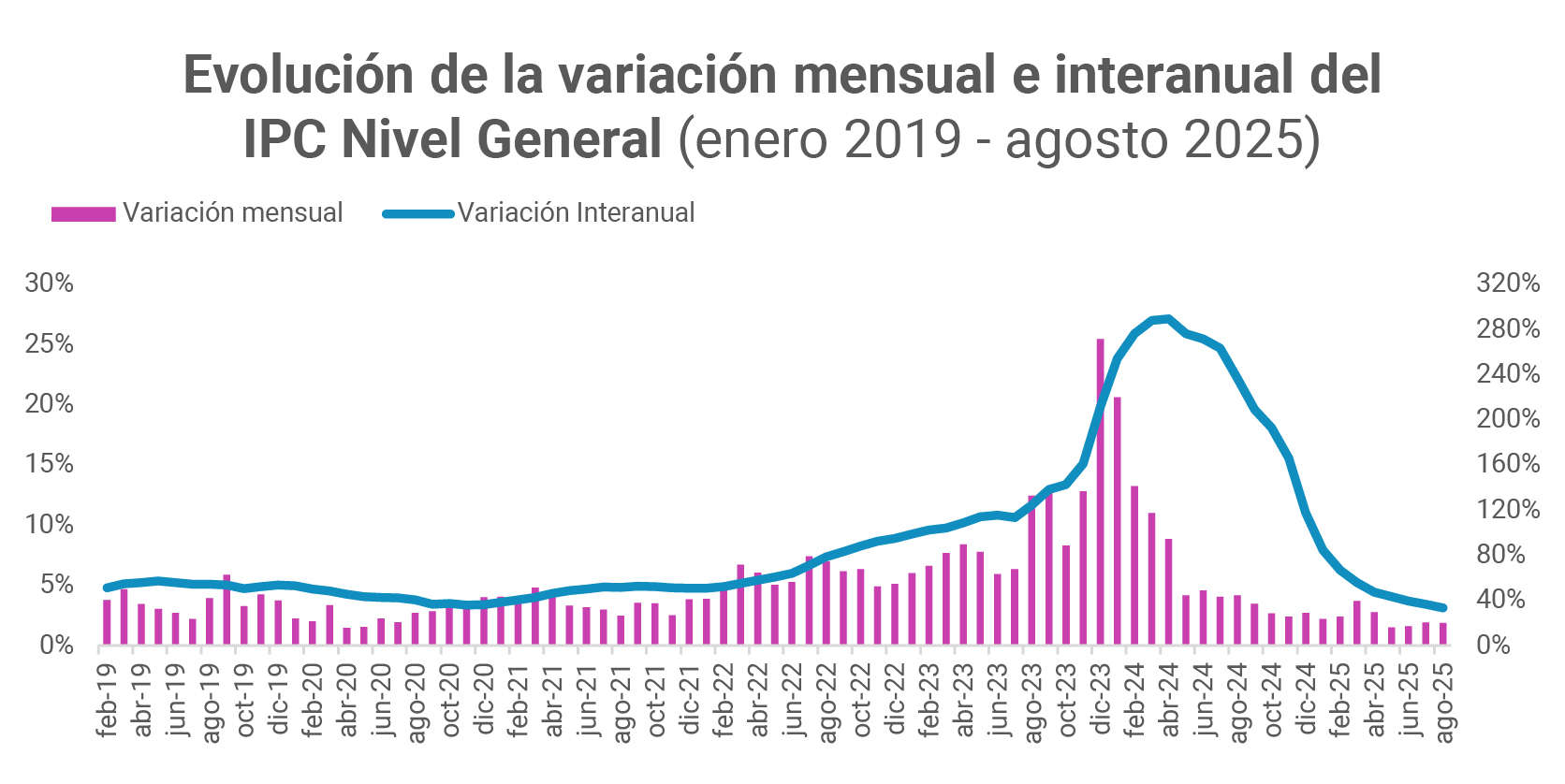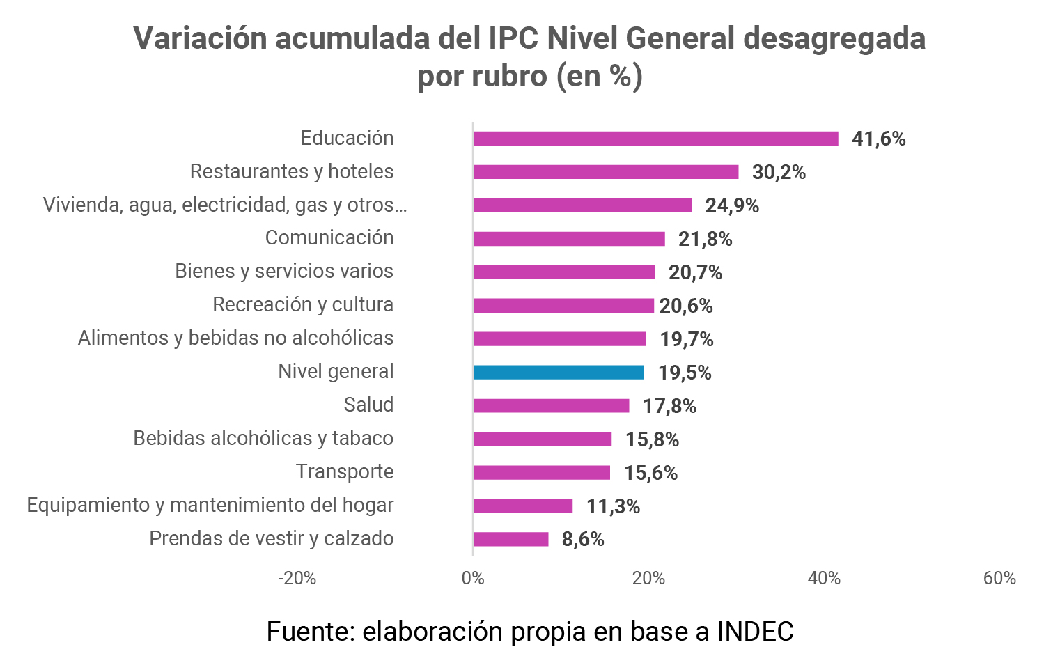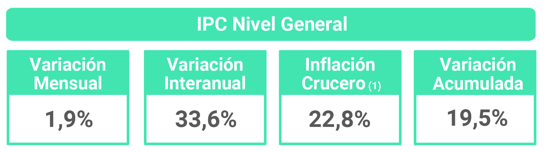 - En base al Índice de Precios al Consumidor publicado por INDEC, se observa que la inflación para el mes de agosto registró un incremento mensual de 1,9%. Si continúa la tendencia de los últimos cuatro meses la inflación anual rondaría un 22,8%. Los rubros que registraron un mayor aumento mensual fueron Transporte (3,6%) y Bebidas alcohólicas y tabaco (3,5%).