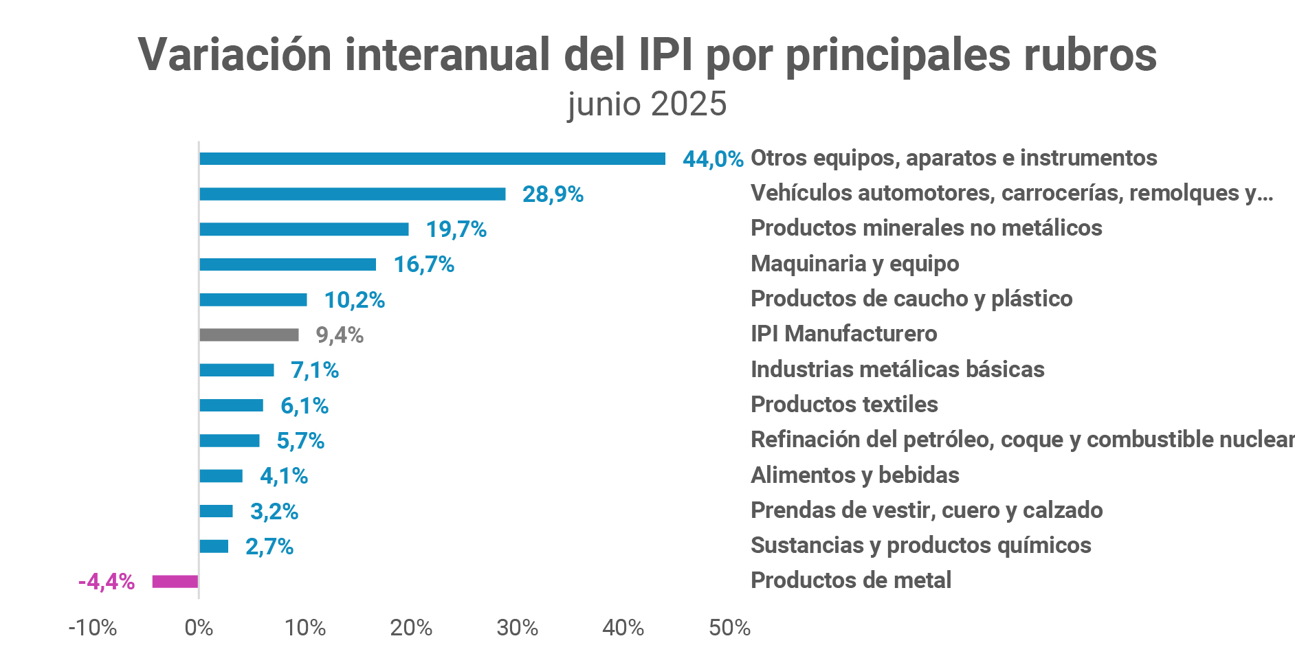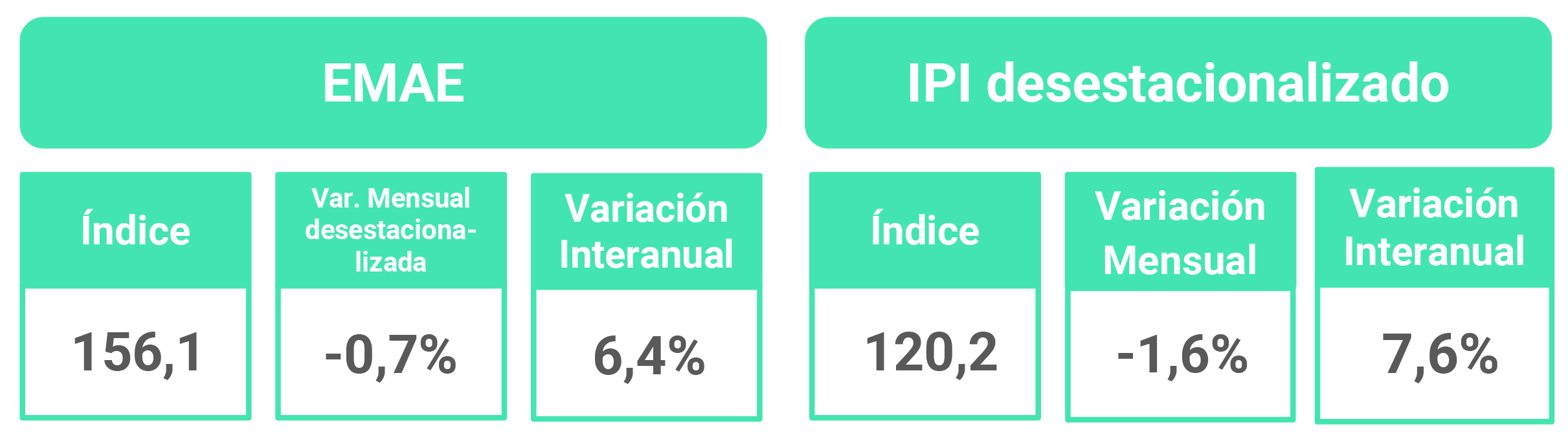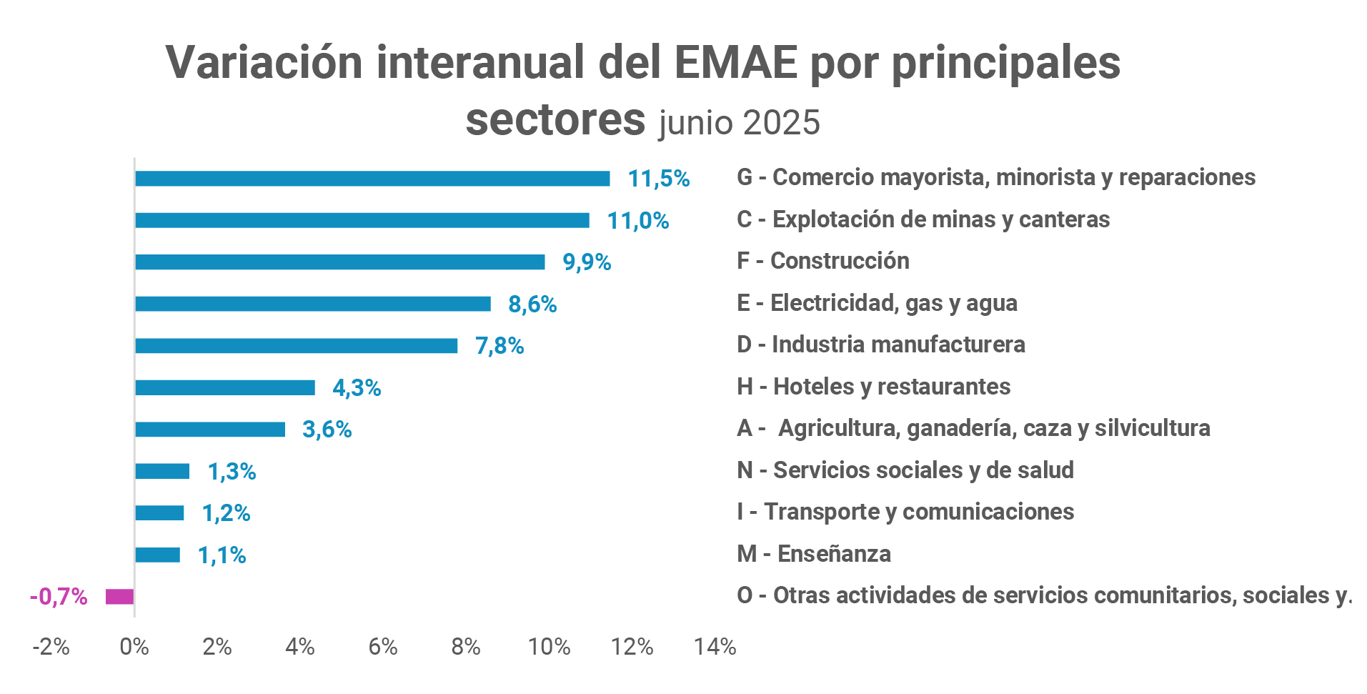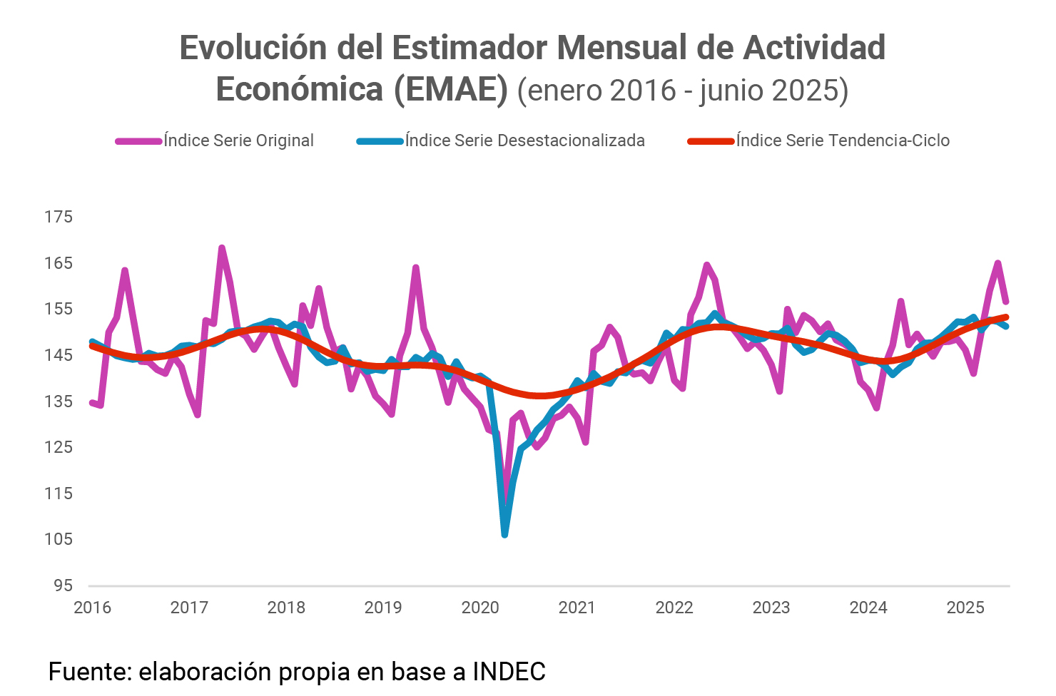- La actividad económica para el mes de junio 2025, según el IPI, presenta una variación mensual negativa de 1,6% y un aumento del 7,6% respecto a igual mes en el 2024 en la serie desestacionalizada. Para junio según el EMAE, la actividad registró una suba de 6,4% interanual para la serie original, y mensualmente una caída del 0,7% para la serie desestacionalizada.
