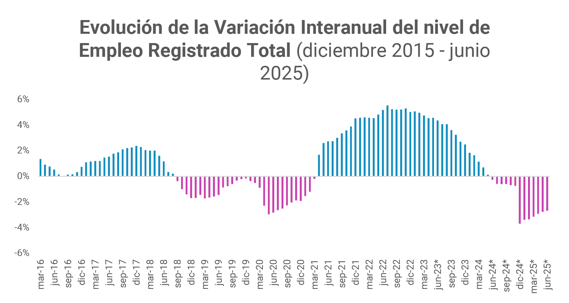 - En junio 2025 el empleo registrado tuvo una caída del 2,7% interanual a nivel nacional (-354 mil trabajadores).