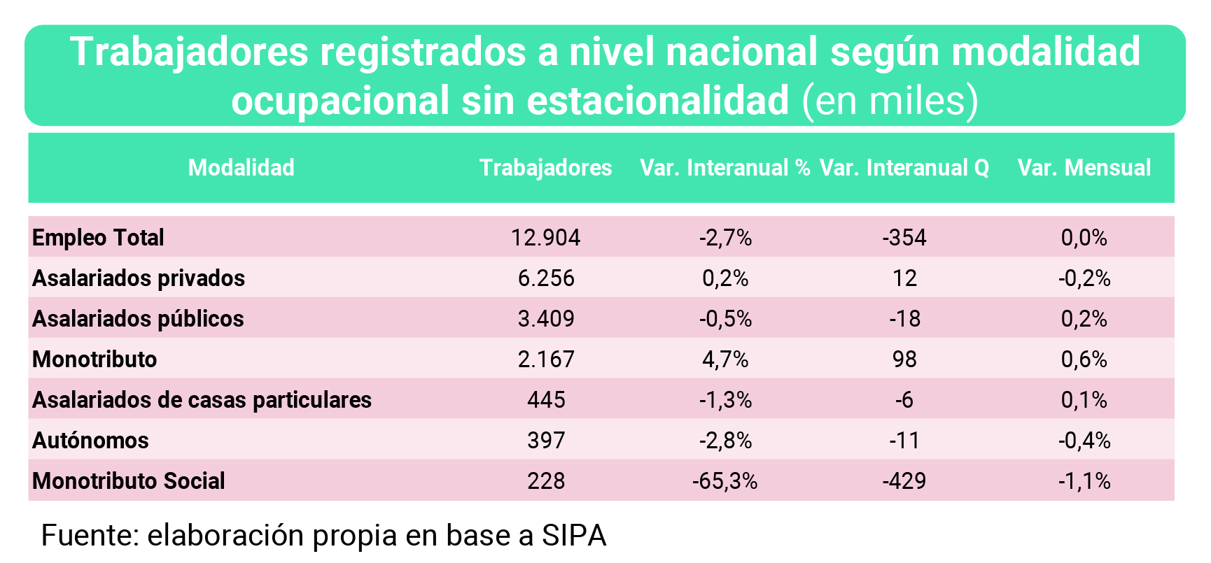 - La disminución se produjo en casi todas las categorías: monotributistas sociales (-429 mil), asalariados públicos (-18 mil), autónomos (-11 mil) y asalariados de casas particulares (-6 mil). Por su parte, el aumento interanual se dio en los monotributistas (+98 mil) y asalariados privados (+12 mil).