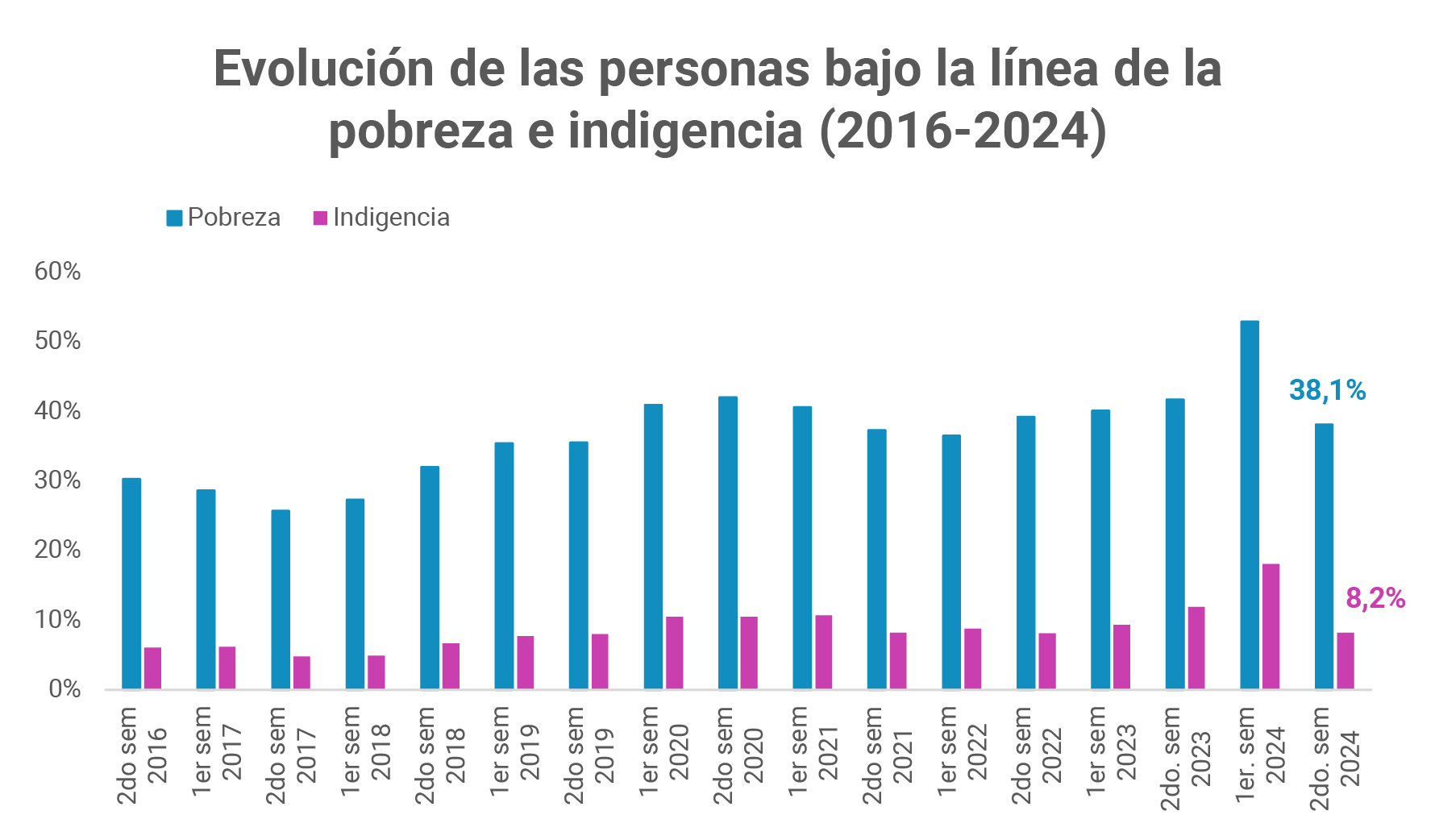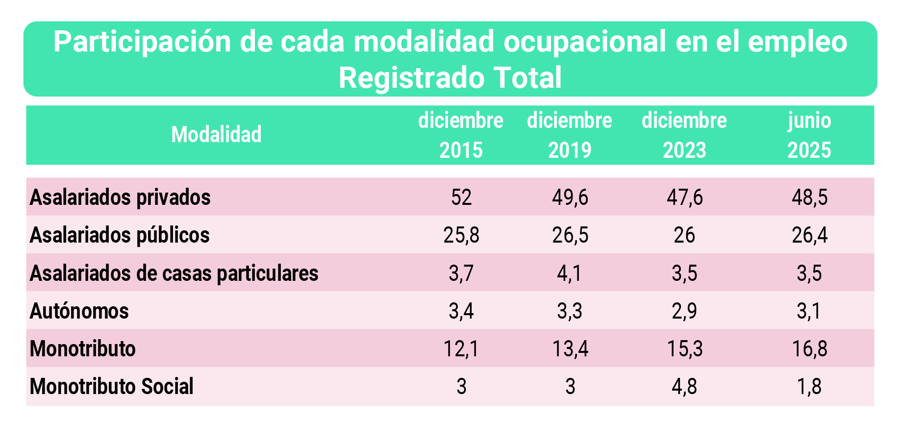 - -Desde diciembre 2015 se evidencia una reconfiguración de la composición del empleo registrado, ganando participación el monotributo (+4,7 p.p) en detrimento del empleo asalariado privado (-3,5 p.p). Respecto a diciembre 2023, los monotributistas sociales cayeron en -3 p.p.