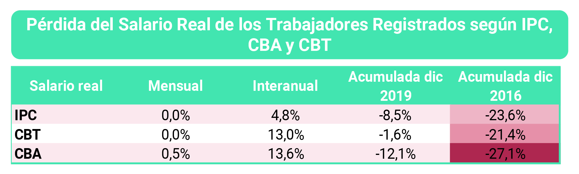 - Para el mes de junio 2025, el salario real medido según IPC para los trabajadores registrados aumento en términos interanuales 4,8%, y registra pérdida respecto al acumulado a diciembre 2019 de 8,5%. Si se tiene en cuenta la pérdida acumulada a diciembre 2016, es mayor ubicándose en 23,6%. En términos de la CBA registra un aumento de 13,6% interanual y una perdida de 12,6% en relación a diciembre de 2019.