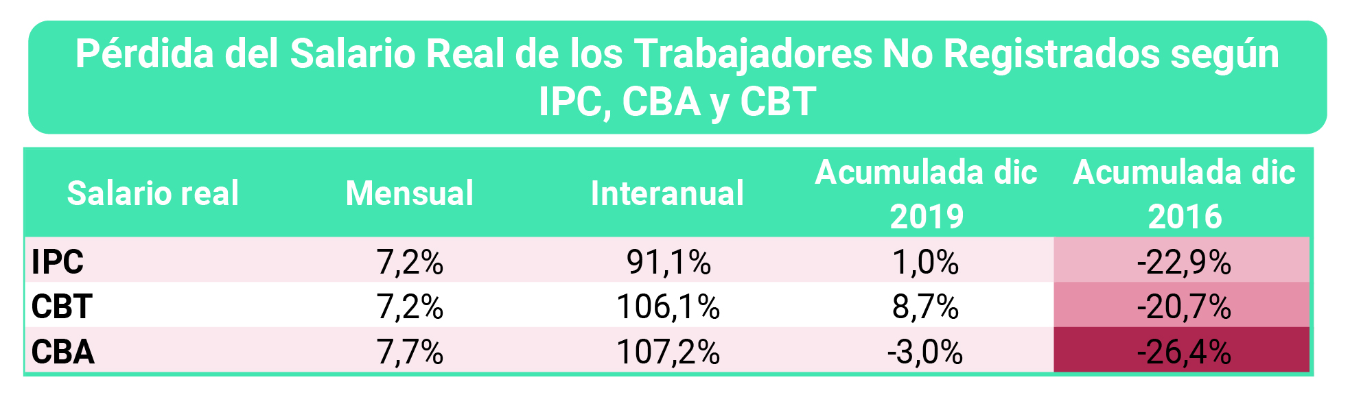 Los trabajadores no registrados por su parte presentan aumentos interanuales: 91,1% y 107,2% en términos de IPC y CBA respectivamente. Sin embargo acumulan una pérdida de 9,9% respecto a diciembre 2016.