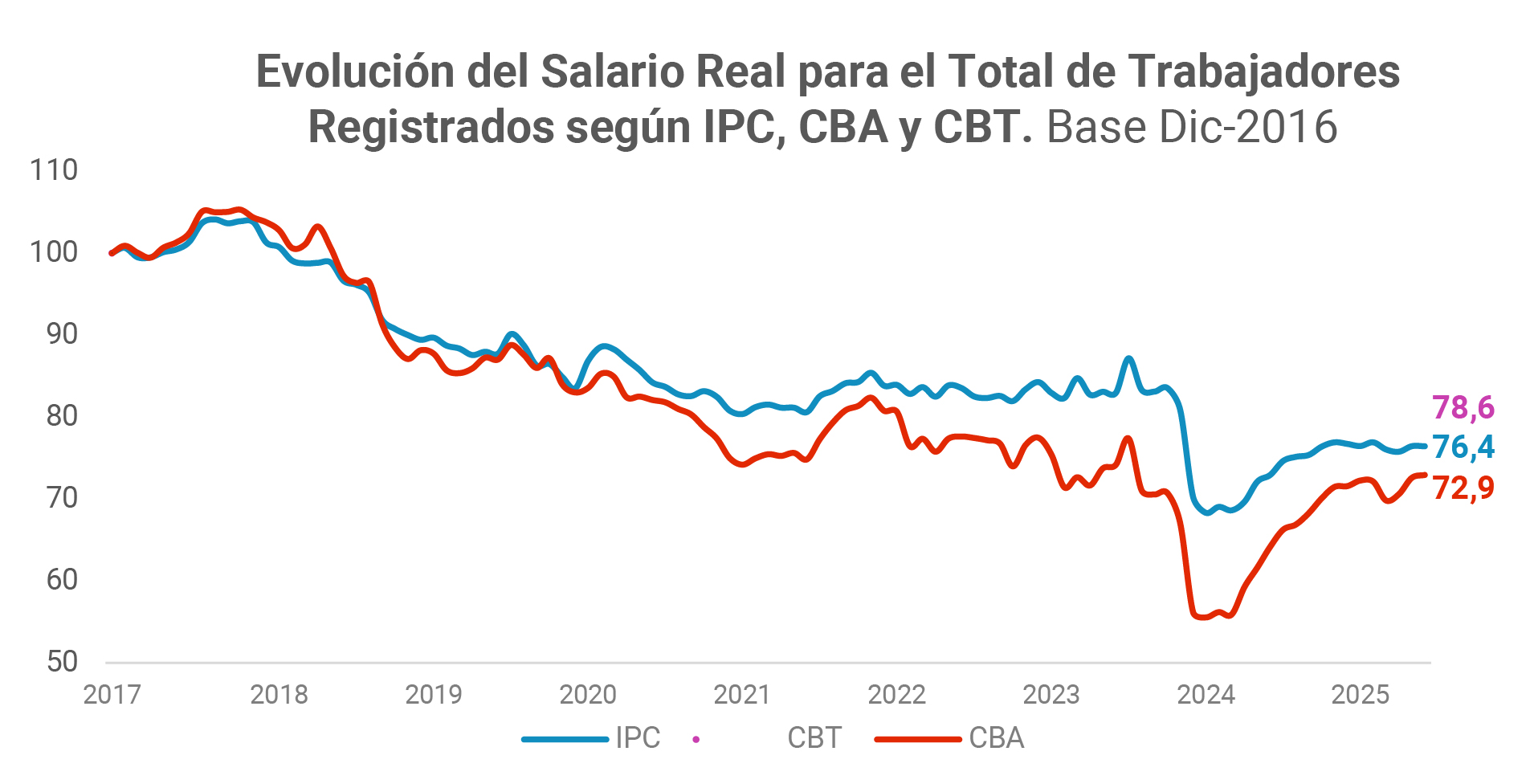 Para el mes de junio 2025, el salario real medido según IPC para los trabajadores registrados aumento en términos interanuales 4,8%, y registra pérdida respecto al acumulado a diciembre 2019 de 8,5%. Si se tiene en cuenta la pérdida acumulada a diciembre 2016, es mayor ubicándose en 23,6%. En términos de la CBA registra un aumento de 13,6% interanual y una pérdida de 12,6% en relación a diciembre de 2019..
