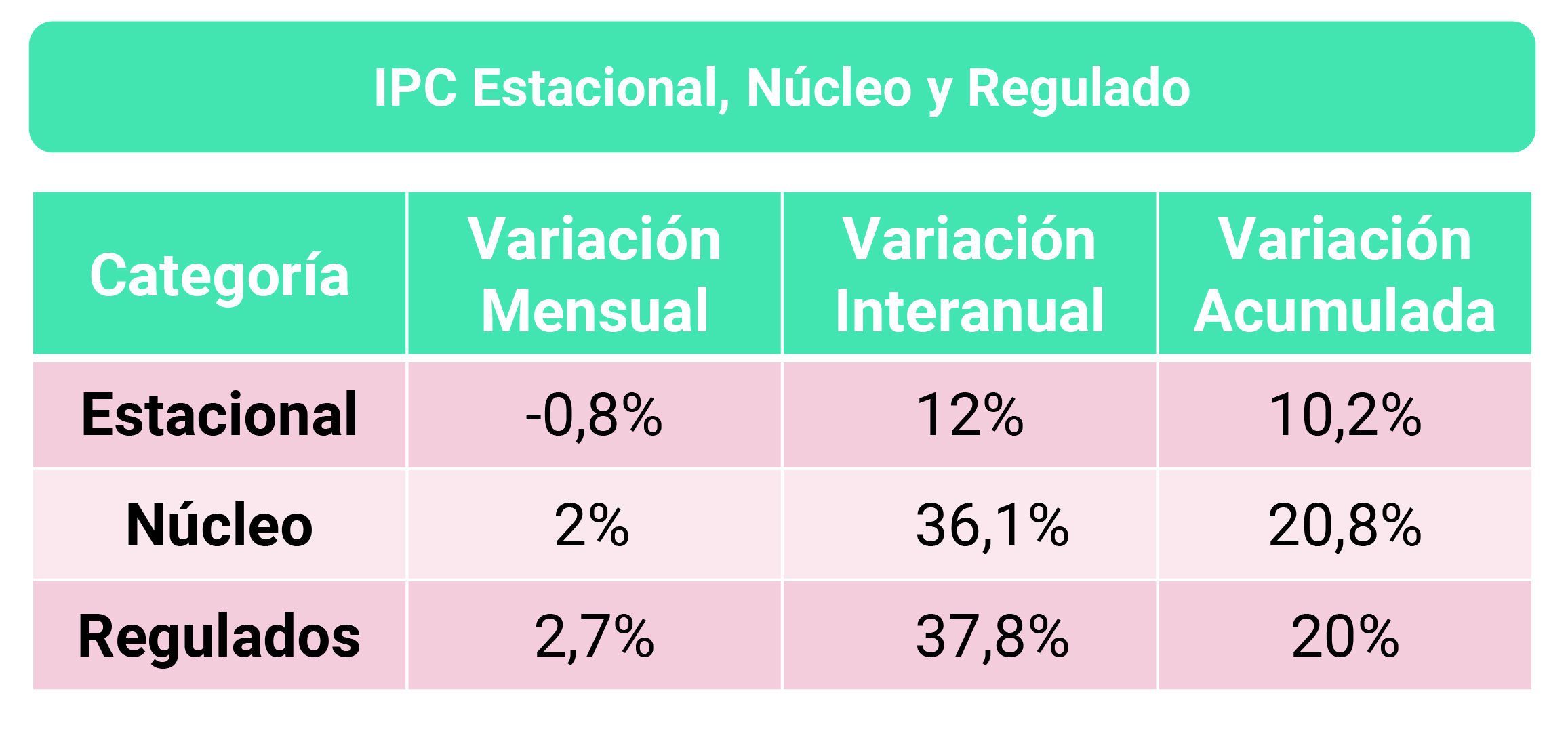 - La inflación núcleo fue del 2% mensual aumentando en 0,6 p.p respecto al mes anterior. En el caso de las categorías Regulados y Estacionales, la variación mensual fue del 2,7% y -0,8% respectivamente.