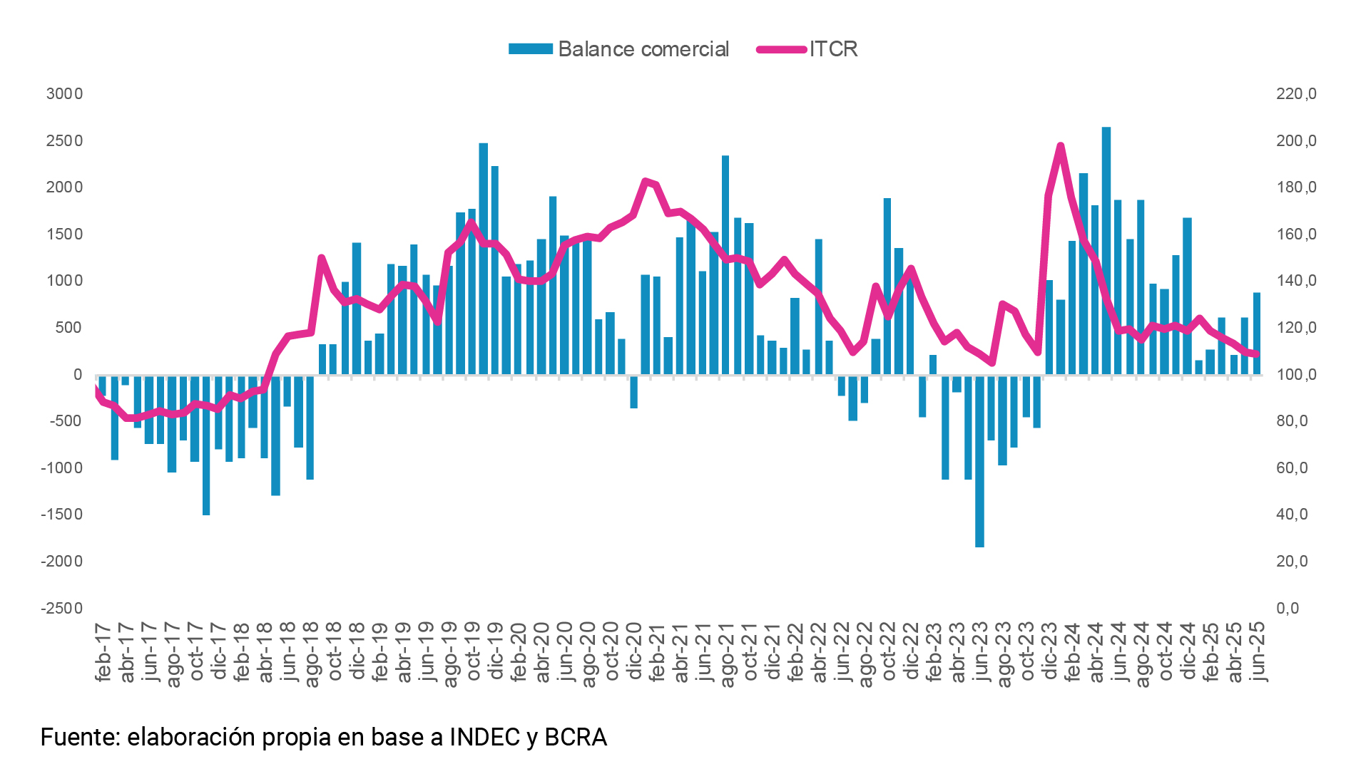 *El ITCR (elaboración propia) corrige el valor del tipo de cambio real ajustándolo por la evolución de los términos de intercambio para Argentina y por el índice de salarios, lo cual resulta en un mejor estimador de la competitividad comercial del país.