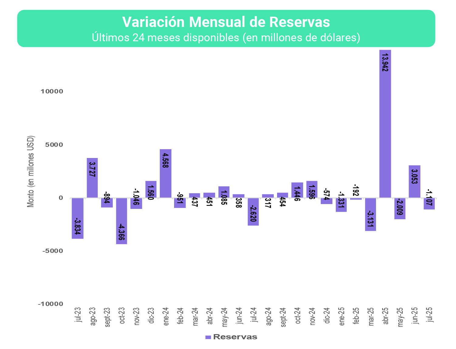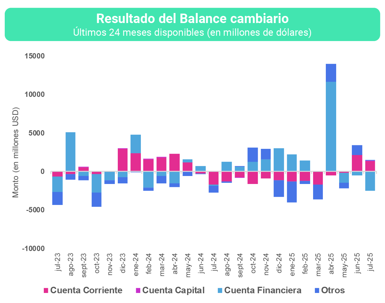 El Balance del mercado cambiario para el mes de julio 2025 registro un déficit de 1.031 USD millones. El superávit de cuenta corriente producto del incremento en las exportaciones no bastó para compensar el déficit en la cuenta financiera que viene dada por la fuga de capitales.